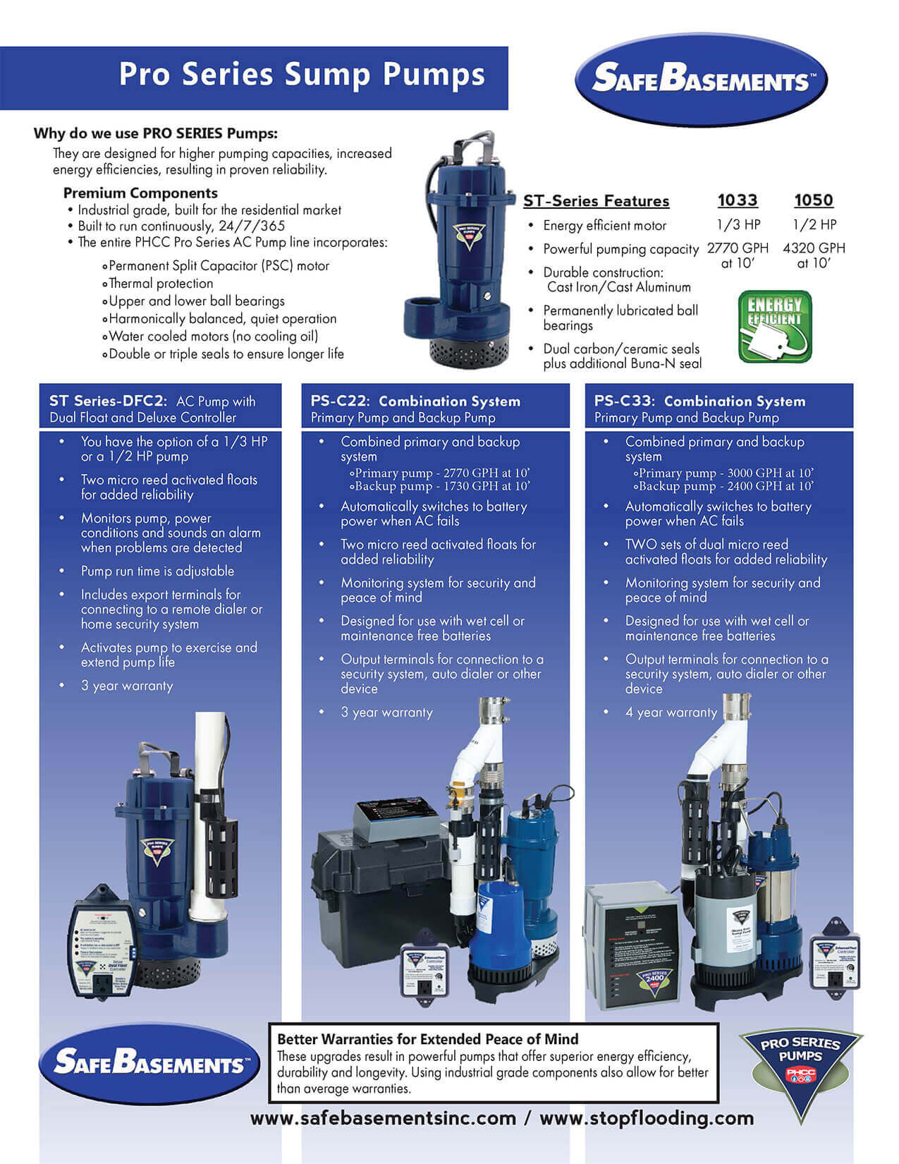 Our sump pumps are specially-designed to be energy efficient and to work together with all of our basement waterproofing products, including SafeEdge™, SafeDrain™, and SafeTrack™. These pumps drain water away from basement walls, control erosion, improve indoor air quality in your home, and even stop radon gas from seeping inside. In addition, they also help lower the water table under the floor and around your home eliminating the need for a basement dehumidifiers.